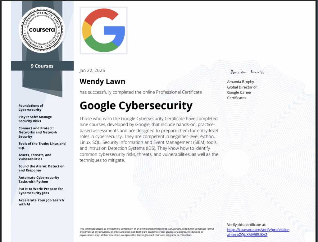Back in January, I completed Google’s Cybersecurity Professional Certificate in Coursera that I started during my holidays in October. My main impetus for this was to create a baselilne of foundational knowledge so I could better understand the intersection between CyberSecurity and AI.