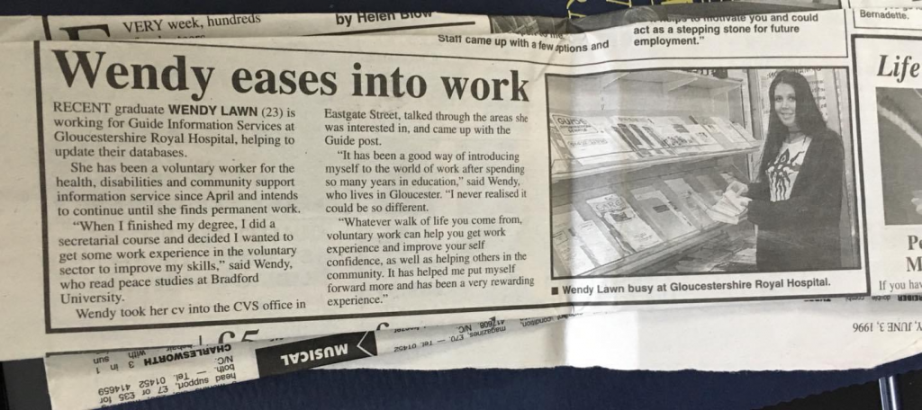 | Temp agency work after University Packer at Candle Factory Gloucester 1996/7 The company handled custom orders for large multinational stores. Tea lights, candles, and pot pourri. IT Support at East-West Insurance Gloucester 1996 Administrator at East-West Insurance Gloucester 1996 Voluntary Graduate Programme: Database Administrator Maintaining GUiDE Information Service database. Office inside Gloucestershire Royal Hospital 1995/6 ![]() One of the few times I made it into the paper! | Part Time work during University 12 hr shifts at Gift Wrap Rolling Factory Summer 1994 Bradford Bar staff cover at Tredwells Arts Cafe, 1993 Bradford Saturday work before University Till Staff – Wyevale Garden Centre, Gloucester 1989-1991 Other hustles: Cat sitting/feeding 2 beautiful cats a short walk from home while their humans were on holiday. Newspaper delivery, makeup sales door-to-door. (Mostly helping my sister for almost free). |